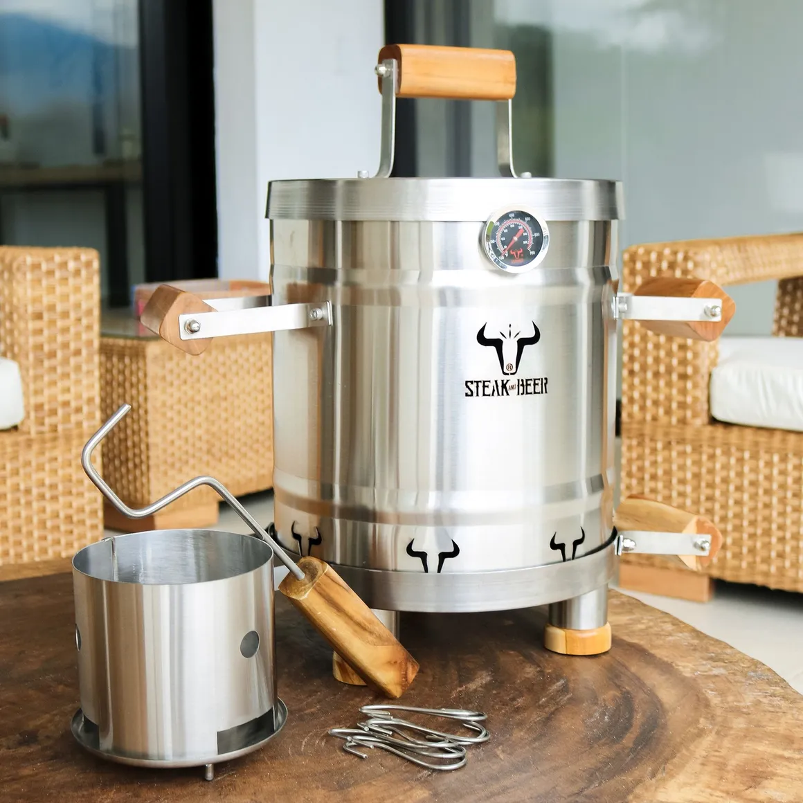 Complementa tu Barril Asador a Carbón en Acero Inoxidable 430 Mini Eco 50x30 Cm 6 Ganchos +1 Parrilla Removible +1 Garfio + 1 Carbonera + 1 Plato Cenicero Steak And Beer