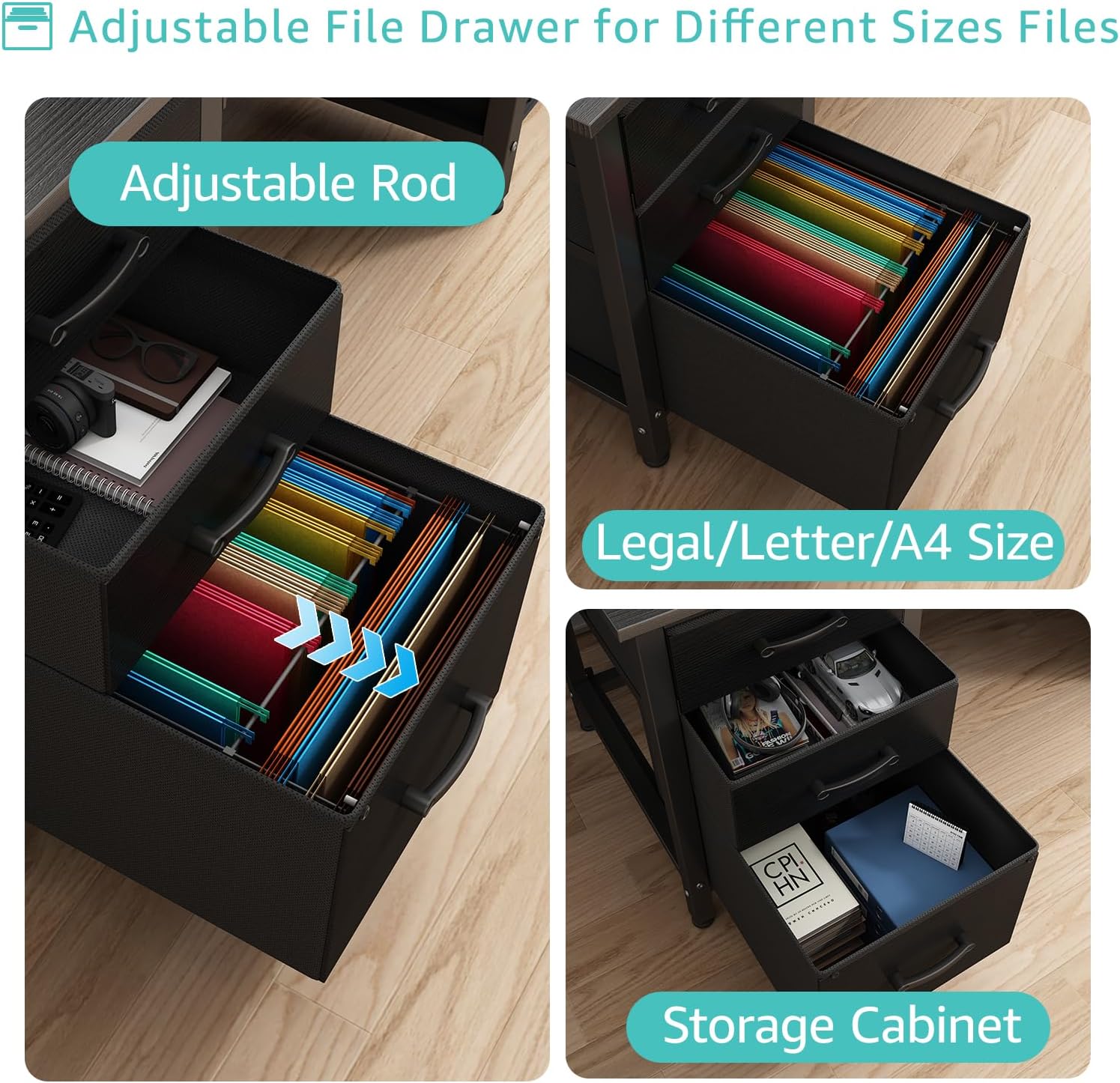 This versatile office desk is designed to enhance your productivity and organization in any room. Key features include: 1. Durable Construction: Made from thick P2 particle wood board with scratch-resistant, anti-collision, and waterproof properties, ensuring long-lasting durability against daily wear and tear. The rustic desktop paired with a black metal steel frame complements various room decors while providing a spacious workstation for activities like working, studying, or gaming. 2. Efficient Storage Solutions: Equipped with three fabric drawers that add lightweight mobility to the desk. One versatile file cabinet helps organize essential items for easy access, while two small drawers offer storage for home office supplies. The adjustable file drawer accommodates both legal and letter size files, and you can choose between left or right installation methods to suit your space. 3. Stable Design: Features extra fixed steel brackets and adjustable leg pads for enhanced stability, keeping the desktop level. Non-slip and anti-scratch protectors under the legs prevent floor damage and reduce noise during movement. 4. Easy Assembly: Comes with a detailed instruction manual and all necessary tools included, allowing for quick setup in approximately 20 minutes without requiring additional equipment. 5. Reliable Support: Backed by professional customer service that ensures easy and fast replacement in case of any quality issues with the desk. Ideal for home offices or small spaces seeking a functional and stylish solution.